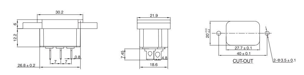 治具插座S-03系列,單插、二合一、三合一保險插座等多種規格,大電流10A ,15A,產品通過UL VDE CCC CB等認證,常見于家用電器,音響功放機等